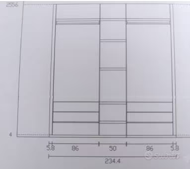 Cabina armadio composta da: 2 moduli larghezza 86cm con un ripiano, un tubo appendiabiti, 2 cassetti 1 modulo con 5 ripiani