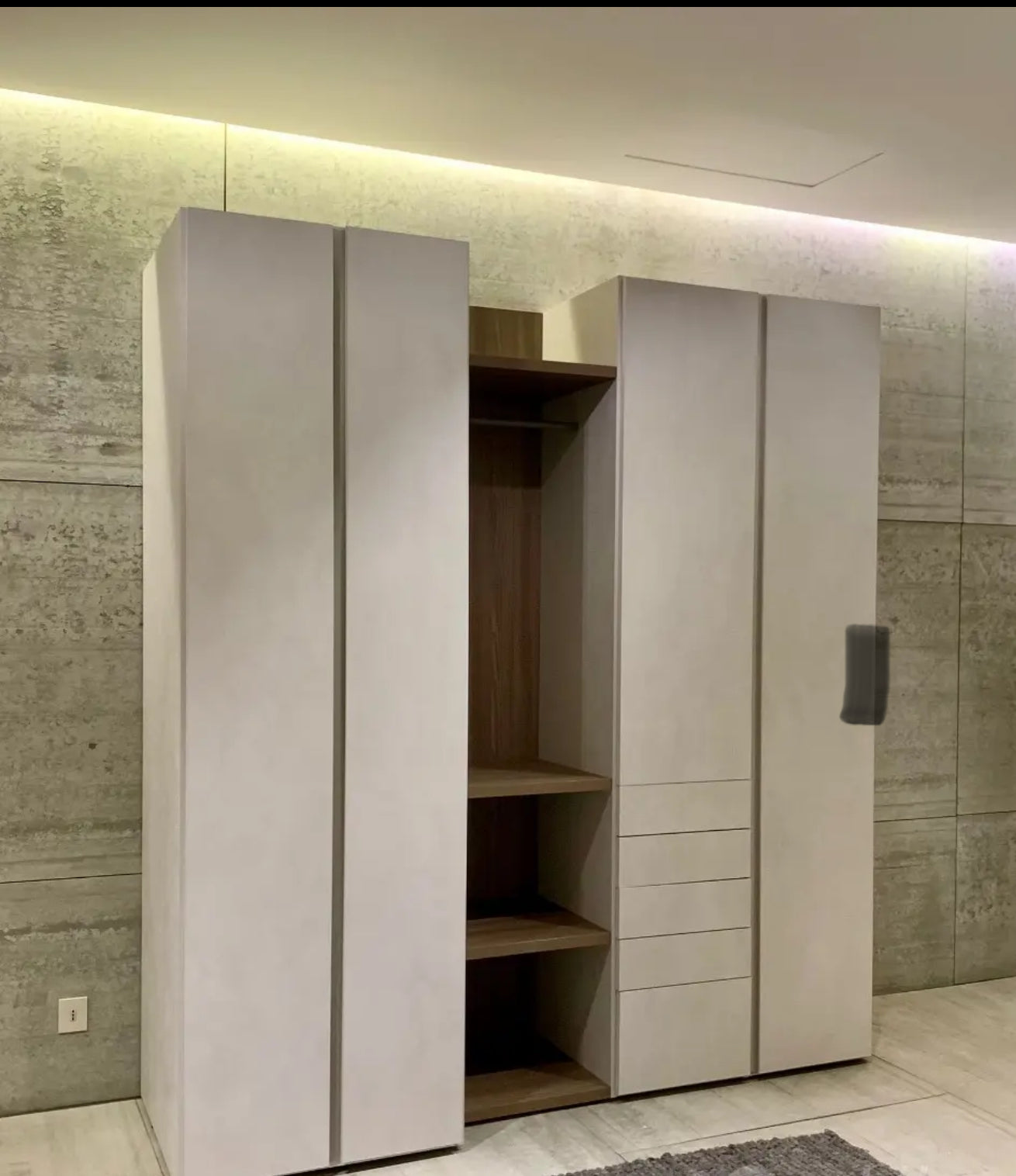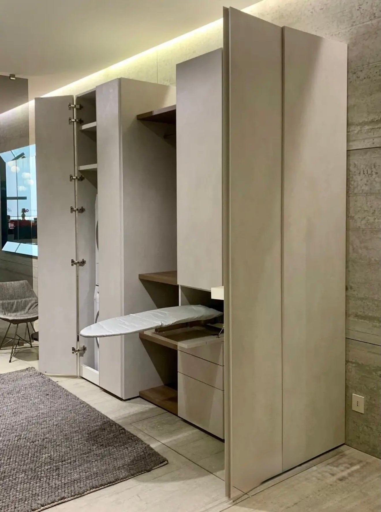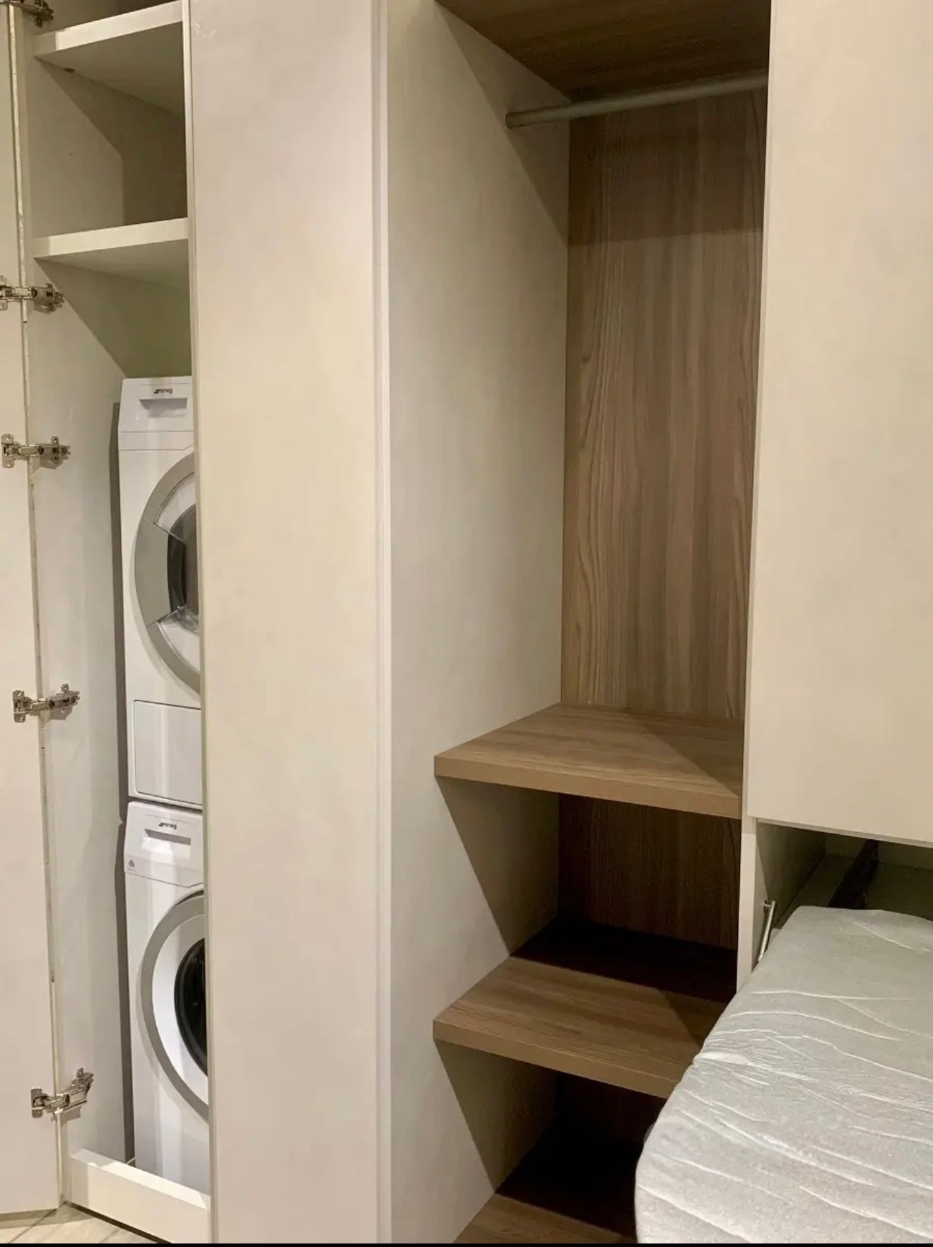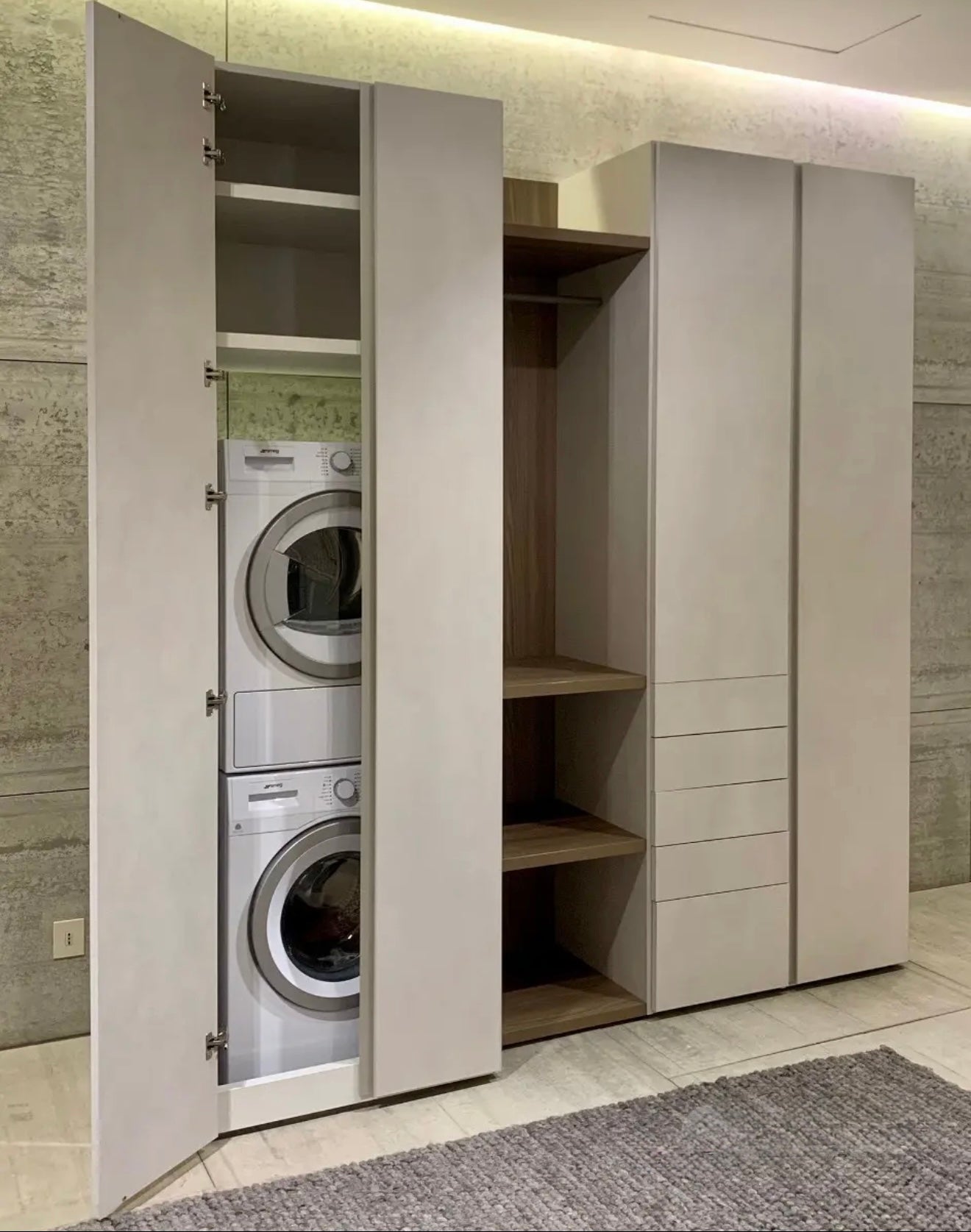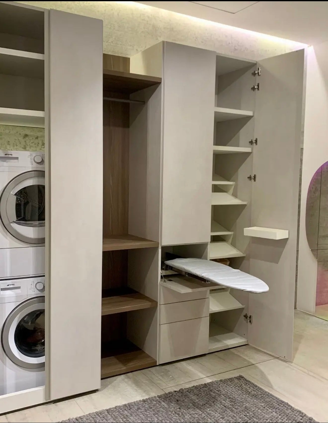 Armadio lavanderia composto da: un modulo contenitore in finitura nobilitato rasato, dove posizionare lavatrice e asciugatrice un modulo a giorno con tubo appendiabiti e tre ripiani, in finitura olmo biscotto un modulo con anta a battente in finitura nobilitato rasato, 3 cassetti, 1 asse da stiro estraibile Un modulo con anta a battente in finitura nobilitato rasato accessoriato con 3 portascarpe in metallo