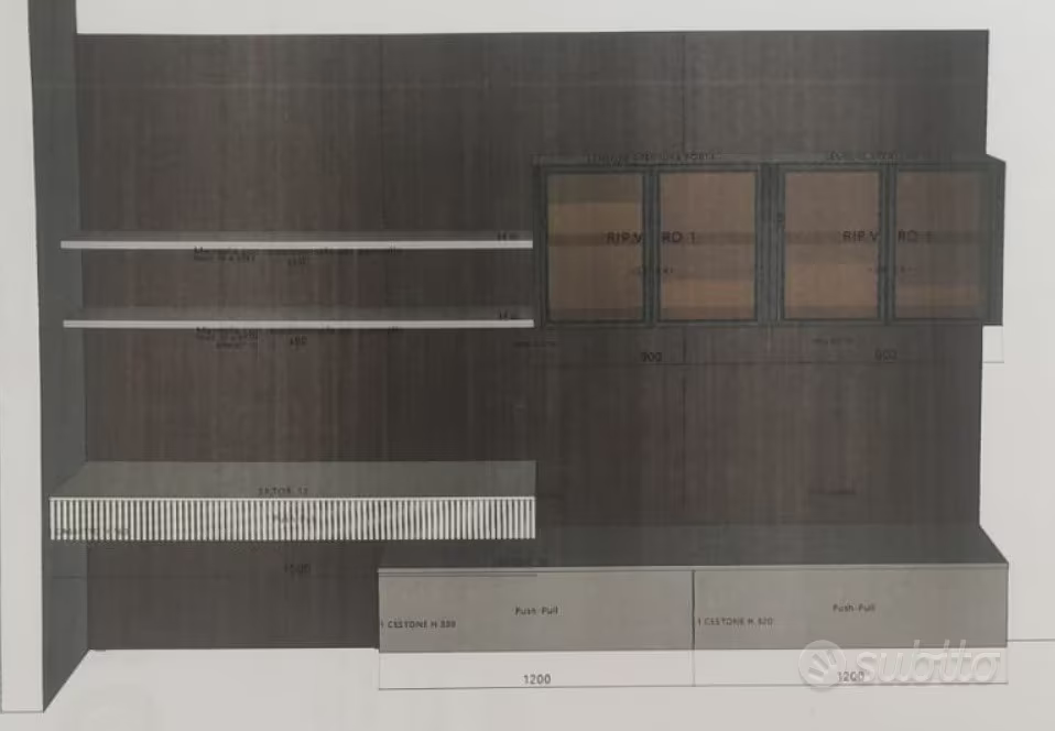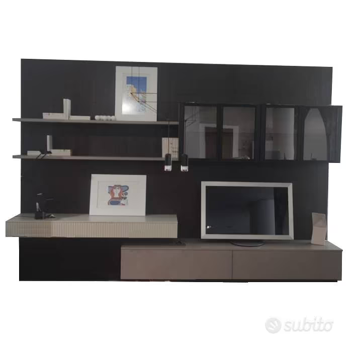 Composizione da parete, come da immagine, realizzata con 2 cestoni sospesi 120x47.6 cm colore visone 3 pannelli boiserie colorer rovere 120x1.9x254.5 cm 1 cassetto Always 180x47.6x16 cm colore Sahara 2 mensole con reggimensole e barra led 180x30x3cm colore visone 2 vetrinette Evans con struttura Visone, ante con telaio nero e vetro bronzo con led verticale interno, 90x33x64cm