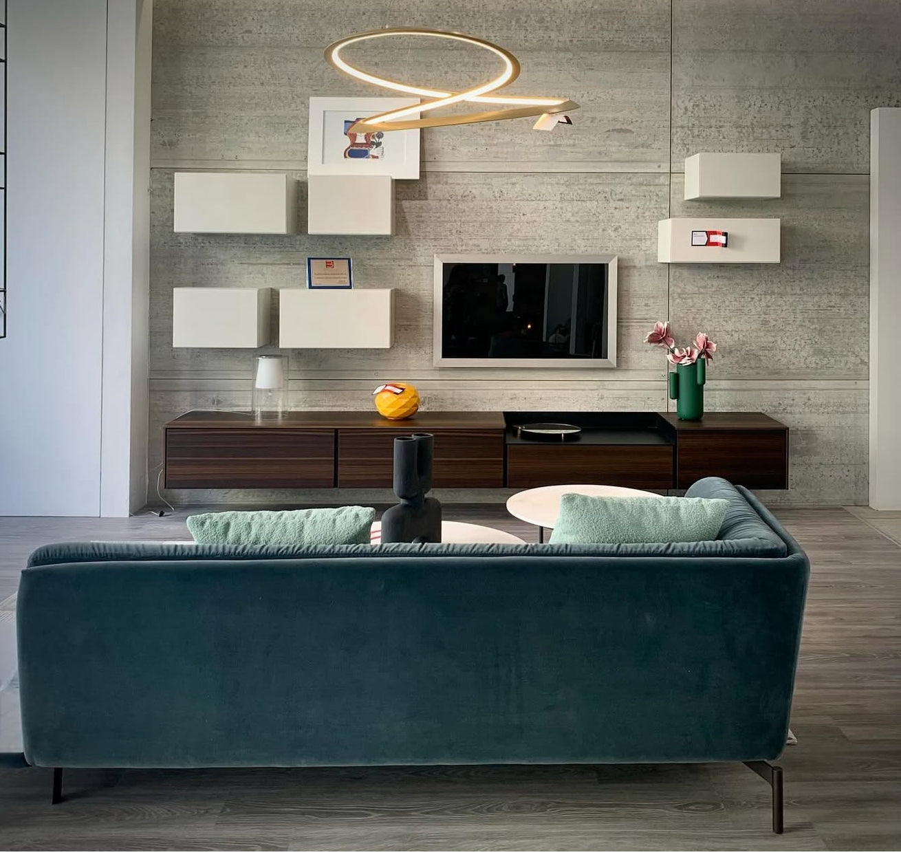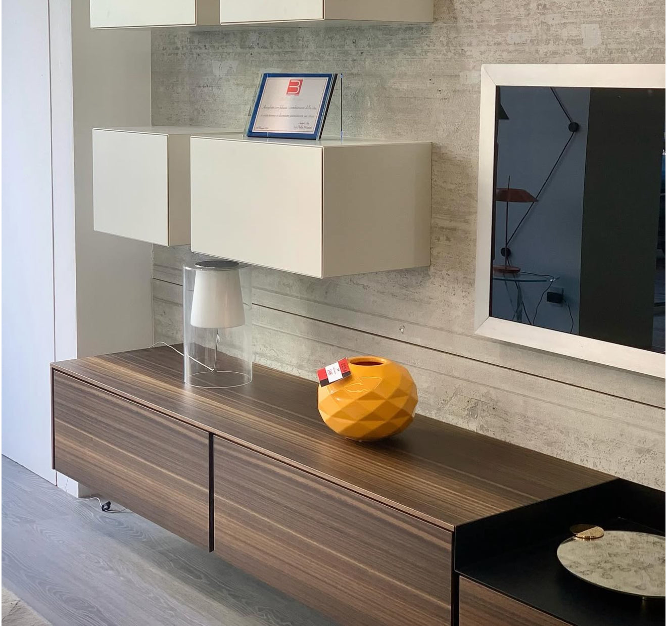 Composizione da parete, come da immagine, realizzata con base porta tv in finitura eucalipto con cestoni estraibili due pensili in colore opaco pomice con apertura a ribalta 4 pensili in colore opaco pomice con apertura a rialzo
