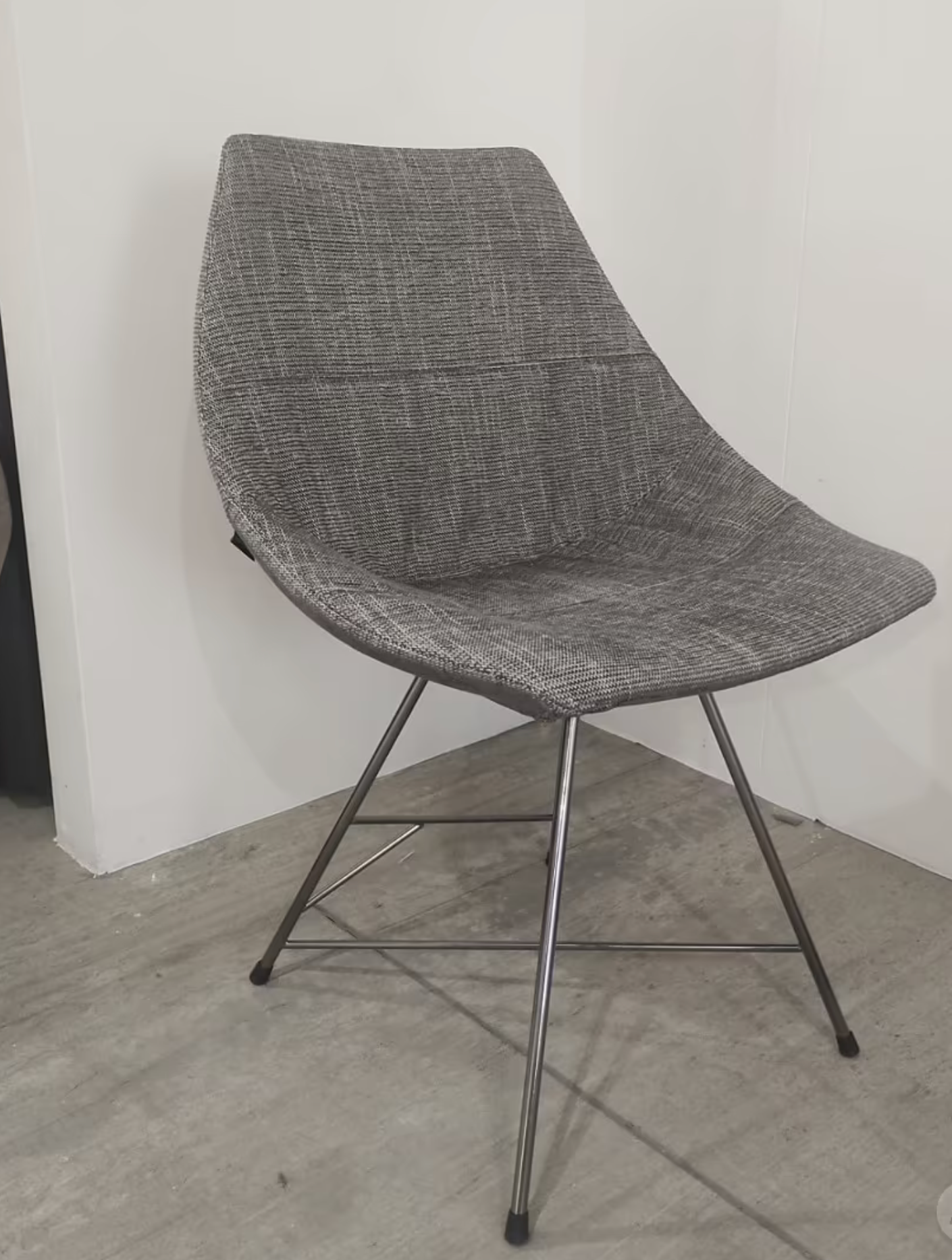 Le linee spezzate e i colori sgargianti impreziosiscono le differenze tra basamenti, stabili e leggeri. La seduta è l’elemento caratterizzante: la forma, che ricorda la sezione di un uovo, è concepita per essere accogliente ed avvolgente, in versione imbottita con rivestimento disponibile in tessuto colore 52. La struttura è realizzata in titanio.
