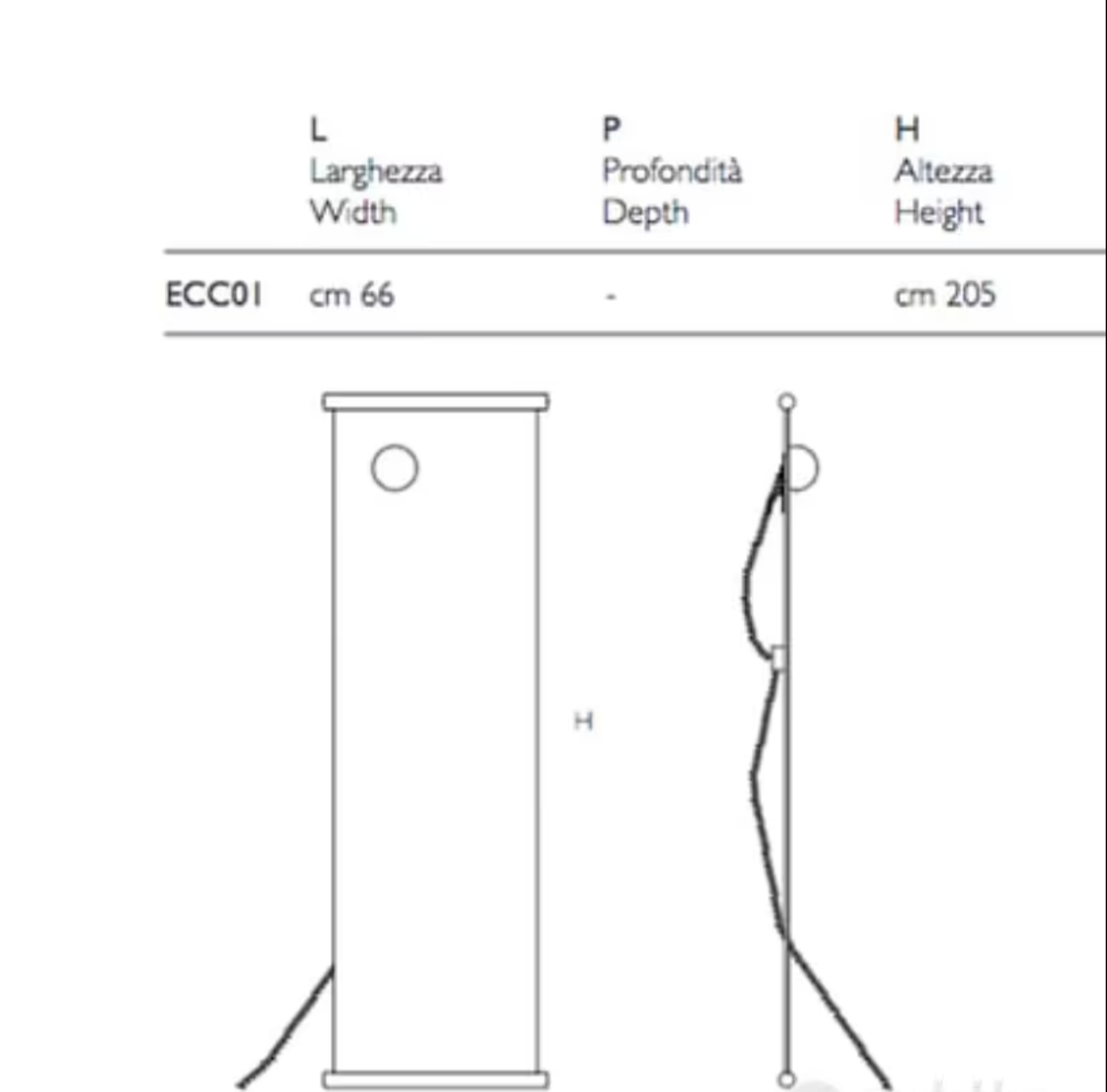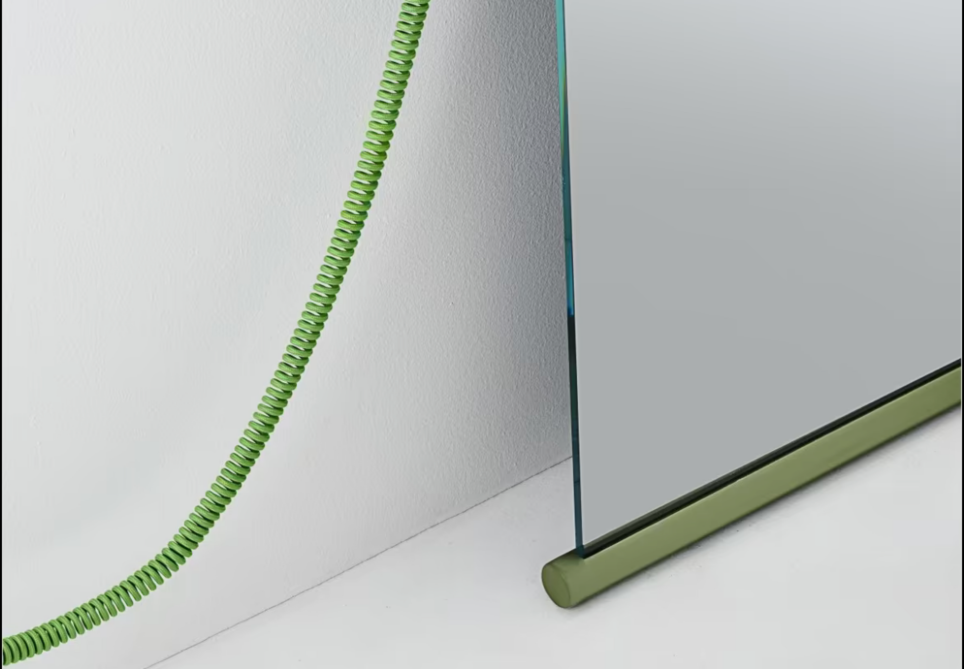Specchio da terra in cristallo extralight, rifinito alle estremità superiore e inferiore da due barre cilindriche in gomma colorata verde. Sullo specchio è applicata una lampada dimmerabile a led di alta qualità. Il diffusore è in vetro di Murano soffiato a bocca, di colore opalino bianco in finitura satinata. Il cavo è rivestito in tessuto verde kiwi.