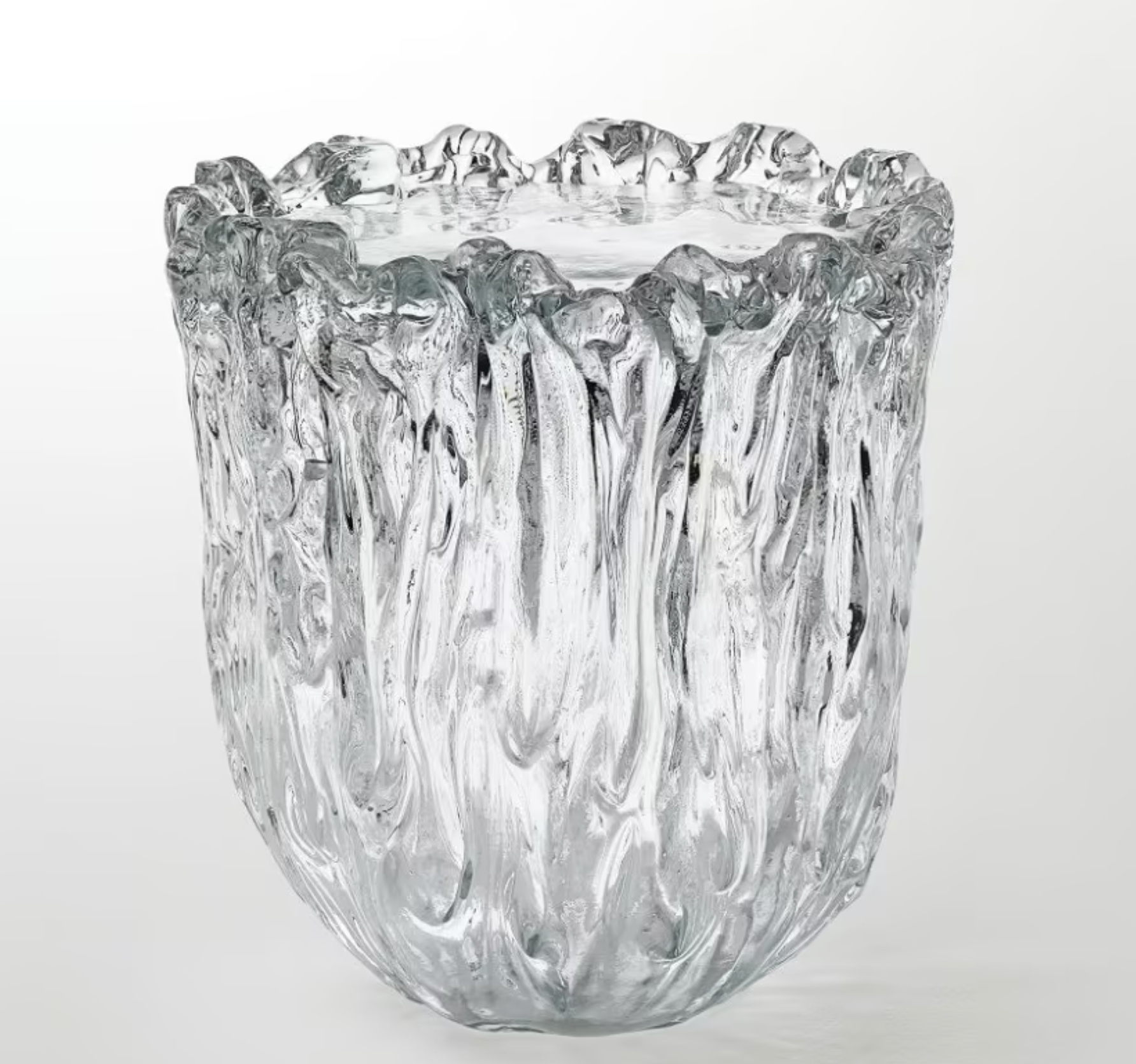 Serie di tavoli bassi rotondi di grande preziosità e poesia, con base in cristallo di Murano colato, modellato e cesellato a mano secondo sapienti tecniche di lavorazione. Il piano è inserito in appoggio all'interno della base. La lavorazione riproduce la poesia dell'acqua che sgorga da una fonte, con tutte le sue increspature e vibranti scintillii. Versione disponibile : ⌀ 38x42h