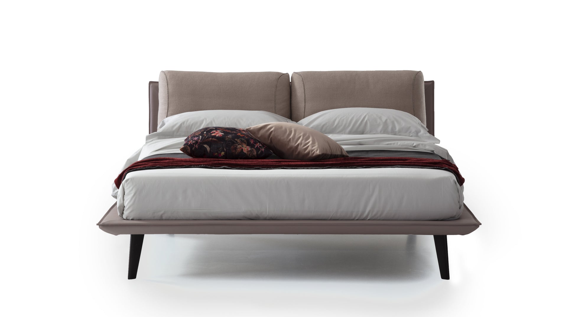 - La leggera struttura di questo letto si contrappone con grazia alla testata, che è caratterizzata da due morbidi cuscini in piuma con cucitura a contrasto.