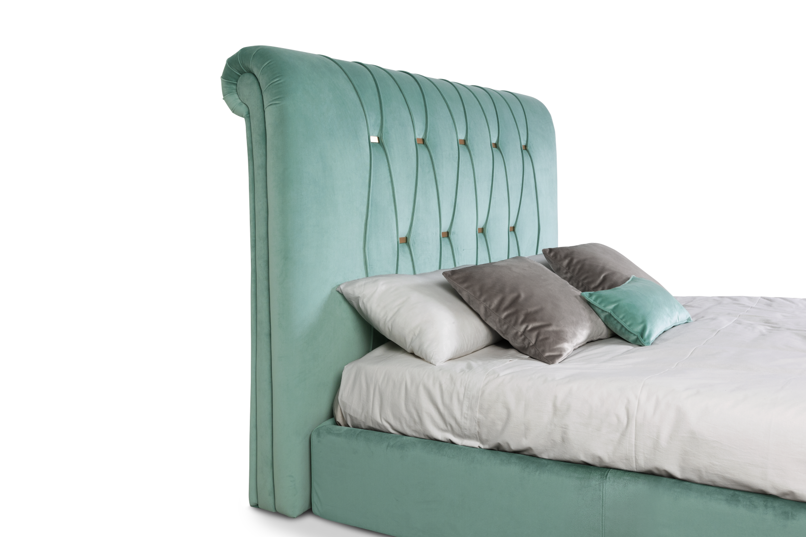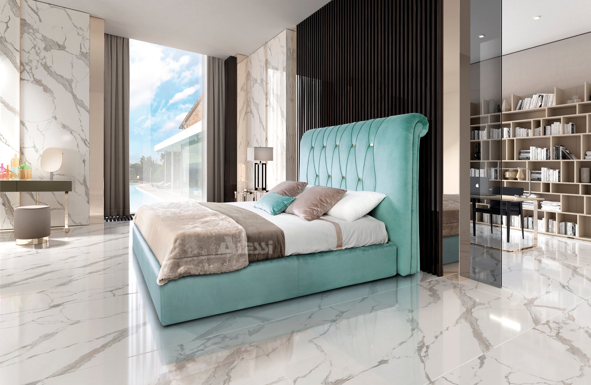 - Zircone combina volumi generosi e lavorazione sartoriale in un letto di forte presenza scenica, ideale per interni eleganti e contemporanei.